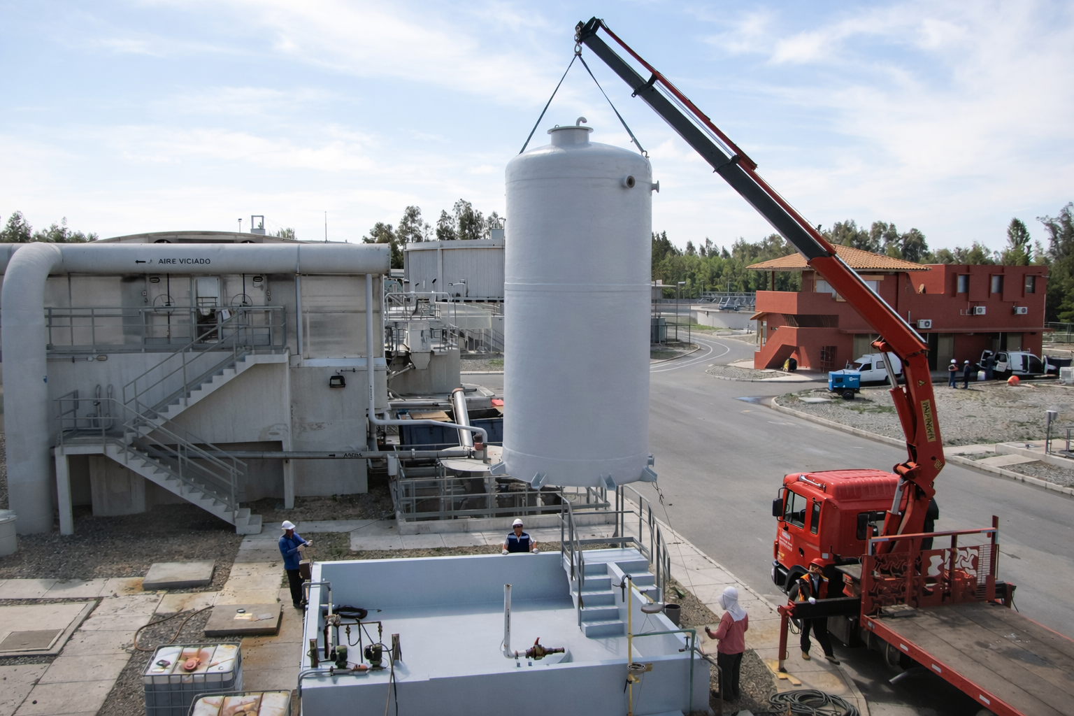 El trabajo contempló la desinstalación del estanque existente, reparación estructural, reacondicionamiento de bases, reposición de válvulas y bridas, además de la aplicación de revestimientos especializados en FRP para protección frente a agentes corrosivos.