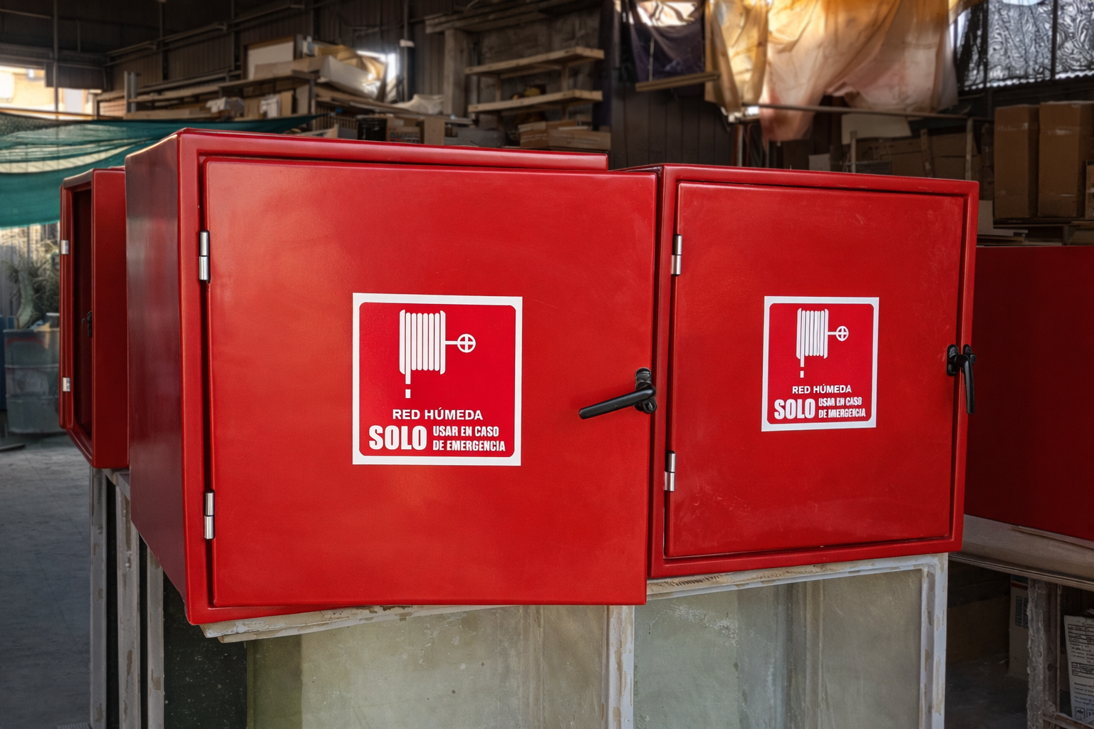 Se fabrican diferentes configuraciones y dimensiones, incluyendo gabinetes para extintores, carretes de manguera y sistemas de red húmeda, adaptándose a los requerimientos técnicos de cada instalación.