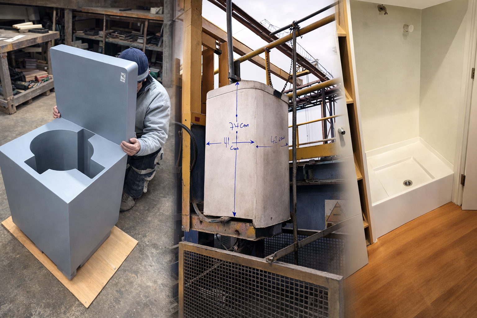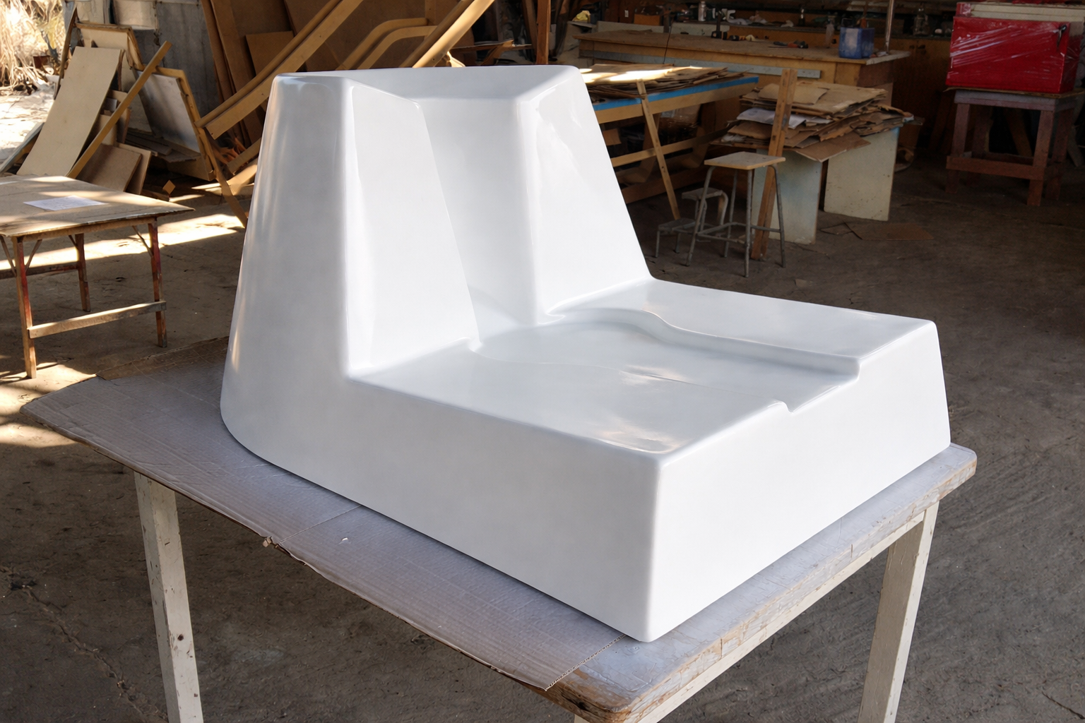 Además, se desarrollaron receptáculos para lavadoras destinados a proyectos habitacionales, fabricados en PRFV con superficie lisa en gelcoat blanco, incorporando estructura metálica de soporte, patas con goma antideslizante y elementos metálicos integrados para asegurar estabilidad, resistencia y fácil instalación.